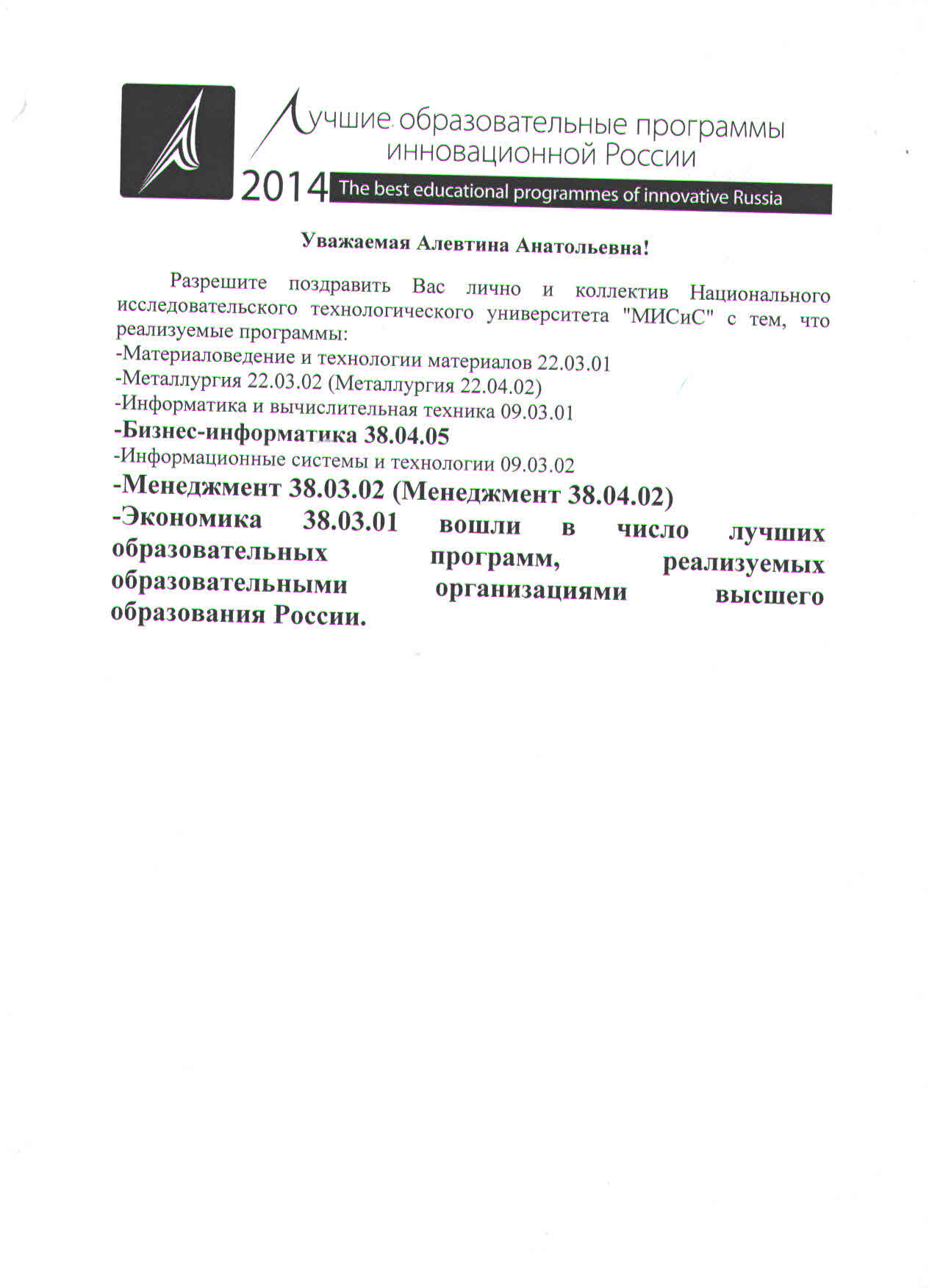 В рамках всероссийского проекта 2014 года «Лучшие образовательные программы инновационной России», в числе лучших образовательных программам, реализуемых образовательными организациями высшего образования России были отобраны программы института экономики и управления промышленными предприятиями (ЭУПП) НИТУ МИСиС.