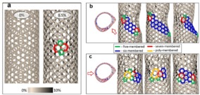 Ученые лаборатории «Неорганические наноматериалы» провели моделирование эксперимента на атомном уровне. Сначала нанотрубки удлинялись до образования первого структурного дефекта, состоящего из двух пятиугольников и двух семиугольников (дефект Стоуна-Уэйлса, см. рис.2а), который, при продолжительном удлинении трубки начинал «расползаться» в стороны, перестраивая другие углеродные связи (рис.2b). Именно на этом этапе происходило изменение структуры нанотрубок. При дальнейшем удлинении начинали формироваться все новые и новые дефекты Стоуна-Уэйлса, приводя в конечном итоге, к изменению проводимости нанотрубок (рис.2).