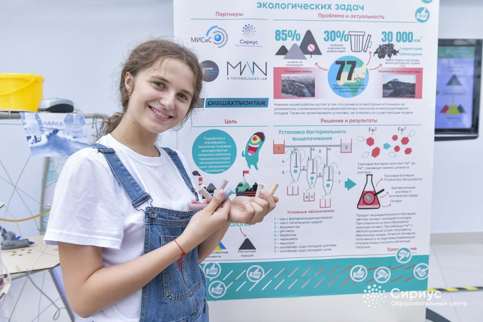 Победителем стал проект «Применение биотехнологий для получения новых материалов и решения ряда экологических задач», направленный на получение из отходов новых материалов, которые могут использоваться в качестве сырья для металлургической промышленности. Проект был представлен на завершающей конференции образовательной программы «Большие вызовы» и получил высокую оценку экспертов. Участникам удалось получить из отходов металлургического производства наноразмерные пигменты 7 разных цветов, которые можно использовать в лакокрасочной, строительной и других областях. Школьники также разработали концепцию установки бактериального выщелачивания.