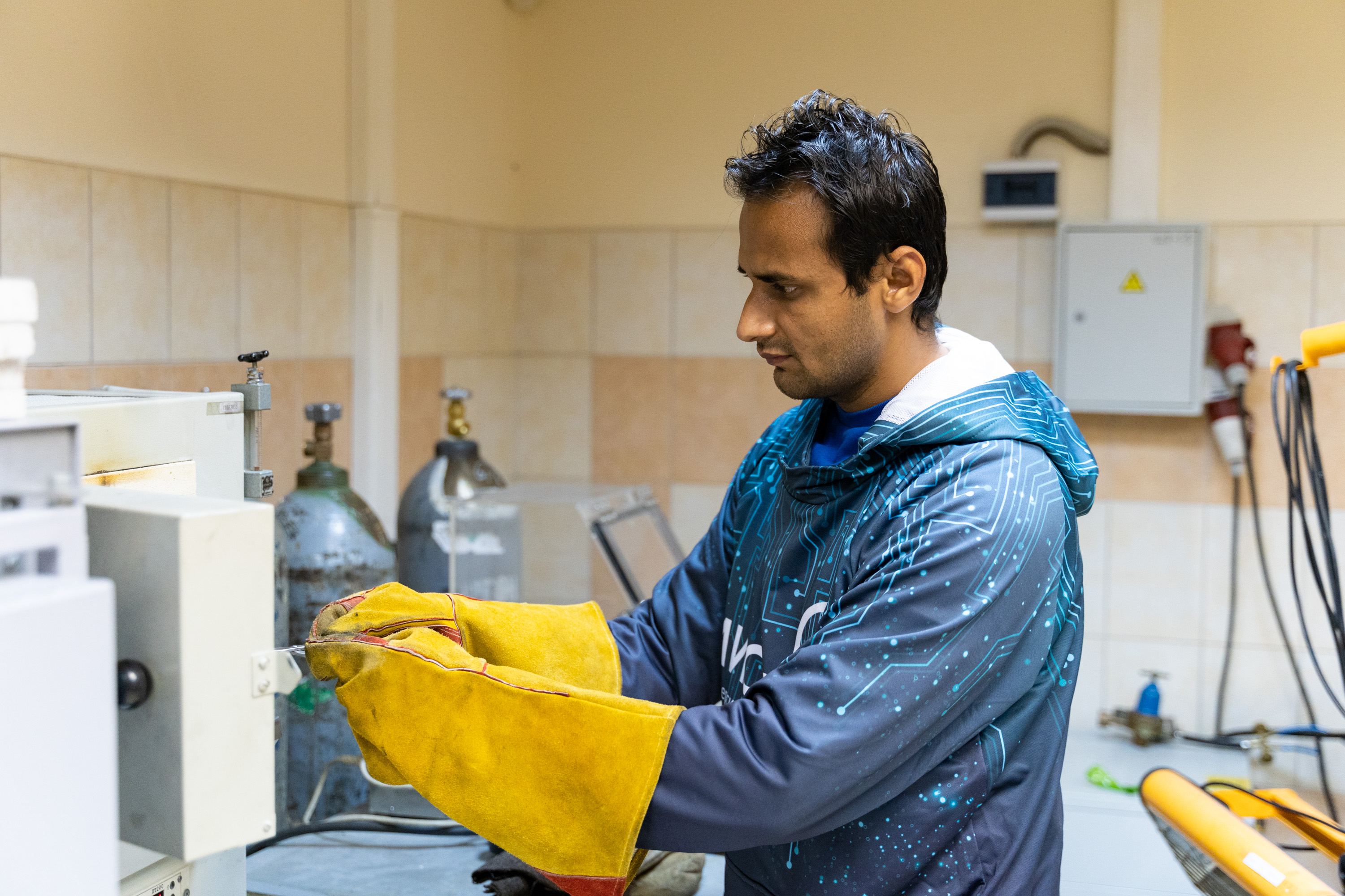 Дмитрий Московских, директор НИЦ «Конструкционные керамические наноматериалы» стоит в лаборатории около оборудованияДмитрий Московских, директор НИЦ «Конструкционные керамические наноматериалы» стоит в лаборатории около оборудования