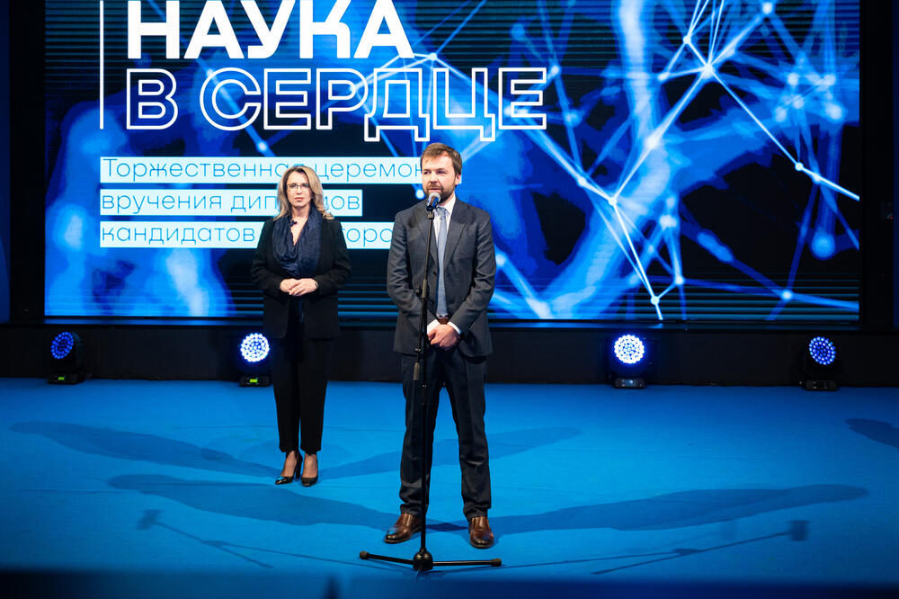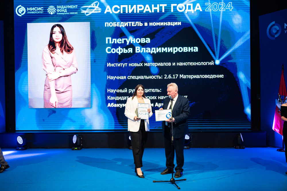 Победительницу конкурса «Аспирант года» Софью Плегунову из Института новых материалов поздравил на сцене проректор по науке и инновациям Михаил Филонов. Она получит единовременную выплату в размере 100 000 рублей от Эндаумент-фонда университета. В портфолио Софьи шесть научных статей, опубликованных в изданиях из перечня WOS и SCOPUS, 14 статей в индексируемых РИНЦ и ВАК журналах, два зарегистрированных патента. Также она победительница семи всероссийских и трёх международных конкурсов и олимпиад, активно выступает с докладами на конференциях. Её научный руководитель — кандидат химических наук, заведующий лабораторией биомедицинских наноматериалов Максим Абакумов.