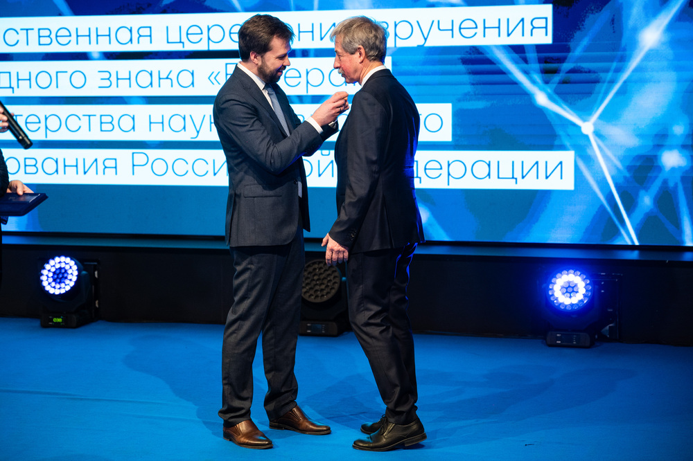 Директор департамента государственной политики в сфере научно-технологического развития Минобрнауки России Антон Шашкин вручил советнику по науке НИТУ МИСИС Андрею Полякову нагрудный знак «Ветеран» Министерства науки и высшего образования РФ. Почётная ведомственная награда присуждается за заслуги и продолжительную работу (более 15 лет) в сфере высшего образования.