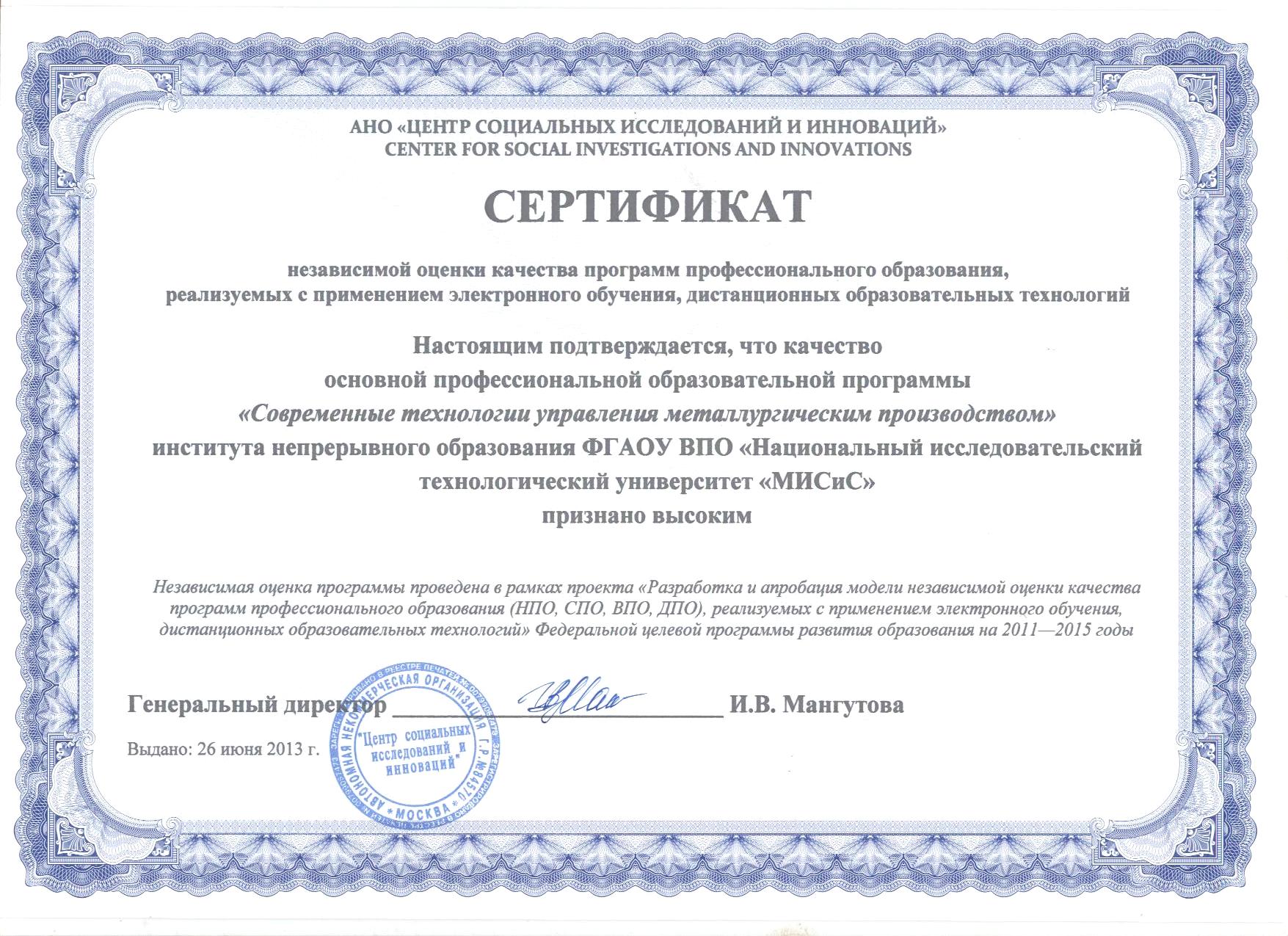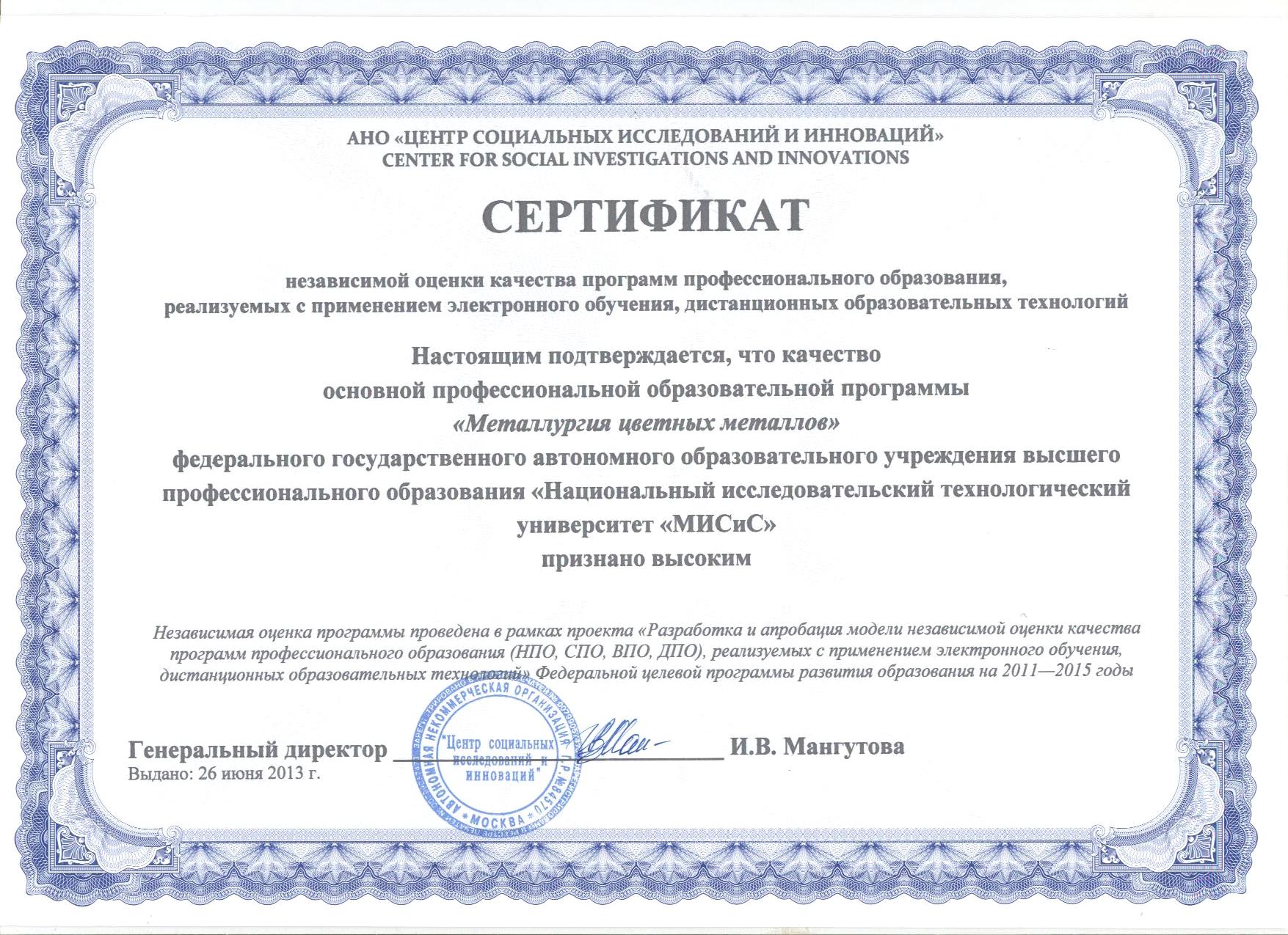 Согласно условиям проекта, аттестации подлежали две образовательные программы ИНОБР — «Современные технологии управления металлургическим производством» и «Металлургия цветных металлов». Обе программы успешно прошли экспертную оценку качества, по итогам которой были вручены сертификаты, подтверждающие высокое качество образовательных программ, реализуемых Институтом непрерывного образования.