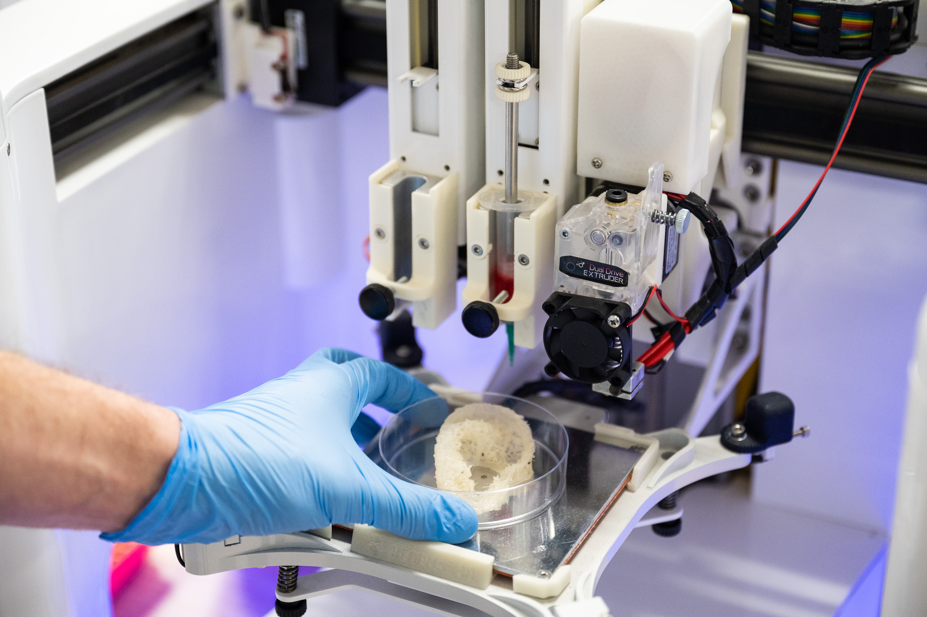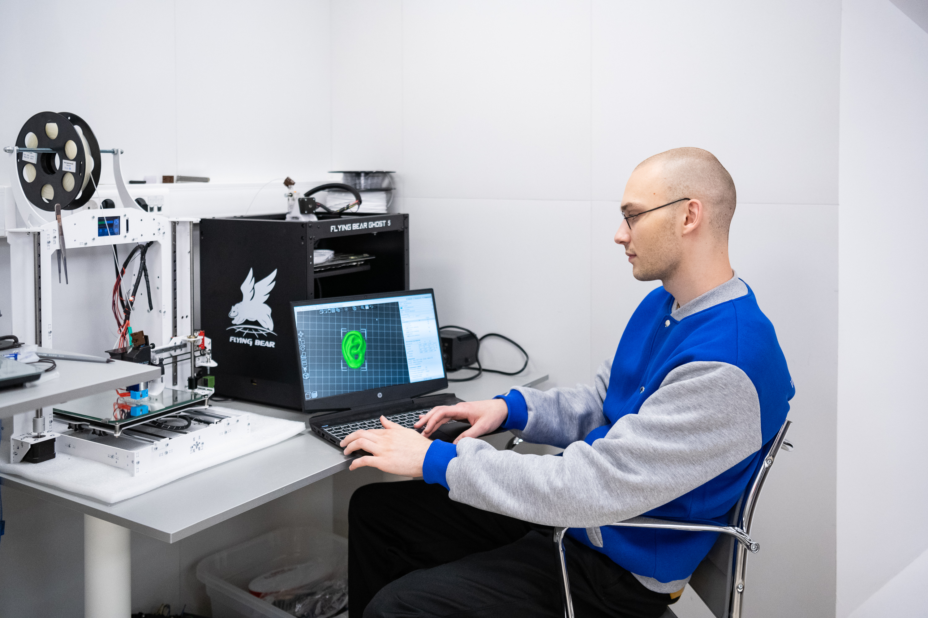 По полученной 3D модели в стерильных условия печатается гибридный полимерный каркас ушной раковины.