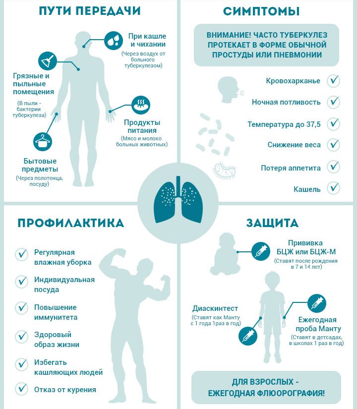 В первую очередь, это прививки против туберкулеза вакциной БЦЖ и флюорографическое обследование органов грудной клетки. Непривитые дети подвергаются большому риску заражения туберкулезом.