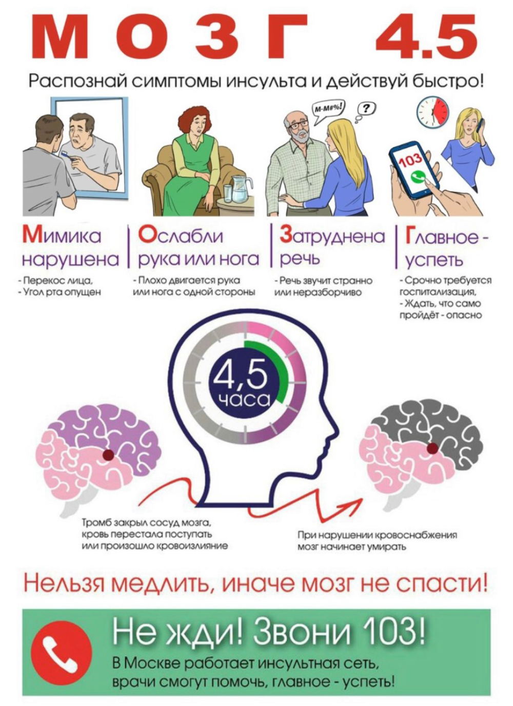 Фундаментом информационно-коммуникационной кампании является концепция «М.О.З.Г. 4,5» — это мнемонический тест, разработанный для эффективного запоминания того, как распознать симптомы инсульта и что именно необходимо сделать: