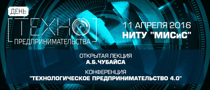 11 апреля 2016 года в НИТУ «МИСиС» состоится День технопредпринимательства, на который соберутся участники инновационного рынка: студенты и преподаватели технических вузов, бизнесмены и создатели высокотехнологичных компаний. Мероприятие начнется с открытой лекции главы РОСНАНО Анатолия Чубайса, посвященной технологическому предпринимательству и глобальным технологическим трендам.